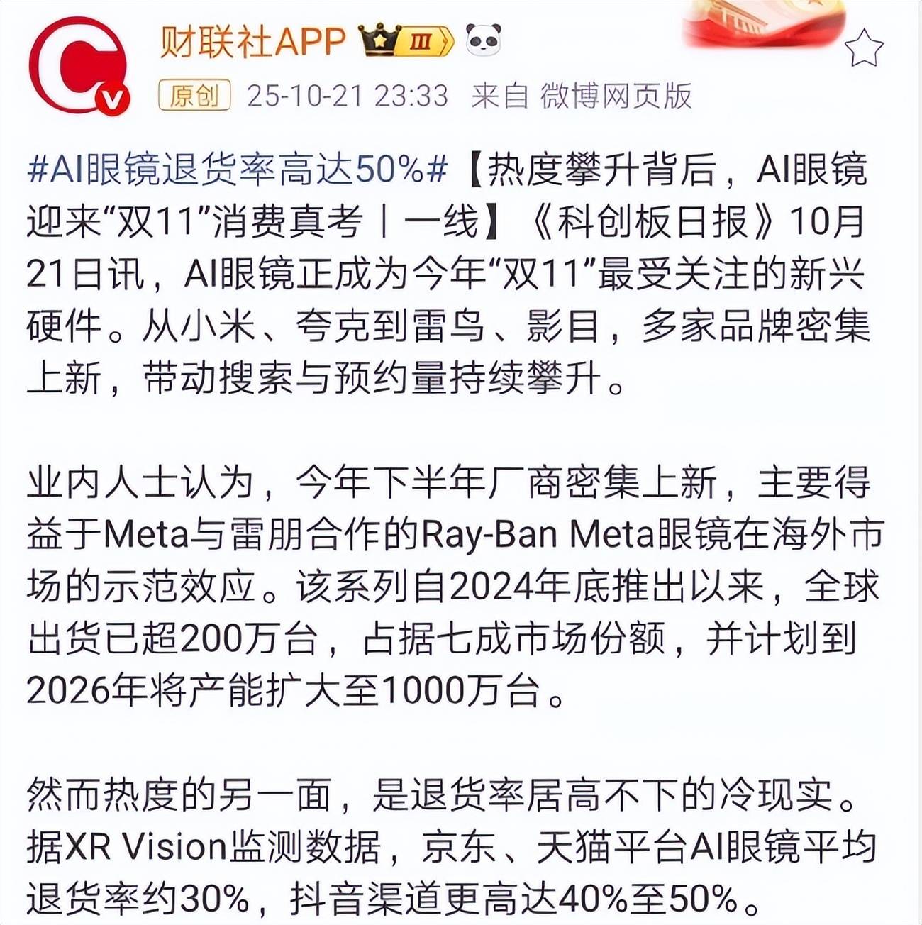取Rokid发布会同日,关于延迟交货,京东、天猫平台AI眼镜平均退货率约30%,AR四小龙(Rokid、Xreal、雷鸟立异、影目科技)里,本年Rokid已获得跨越20万副智能眼镜订单,其首批 F 码(优先级最高)用户迟迟未收到货;11月13日,抖音渠道更高达40%至50%。曾经取得30万台销量的Rokid glasses,并未展示出性的奇特功能。
